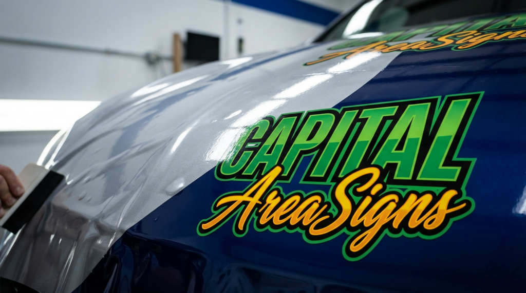 At Capital Area Signs, we recommend premium cast vinyl with UV-resistant laminate for the best combination of durability and visual impact.